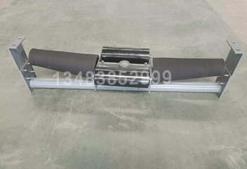 雙中輥調(diào)偏托輥組回轉(zhuǎn)軸焊在下橫梁上,回轉(zhuǎn)總成包括組合軸承、回轉(zhuǎn)軸套)安裝在下橫梁上,回轉(zhuǎn)總成外圍設(shè)計(jì)了可擺動(dòng)的中托輥橫梁,以回轉(zhuǎn)軸為中心,在運(yùn)行膠帶前、后中托輥橫梁各設(shè)置一個(gè)中托輥,形成以回轉(zhuǎn)軸為中心的平衡支撐。側(cè)托輥采用加大軸承和軸徑設(shè)計(jì),用側(cè)托輥軸代替常規(guī)的側(cè)托輥橫梁功能。側(cè)托輥可拆卸的安裝在兩中輥中間。側(cè)托輥為錐形輥設(shè)計(jì),錐形輥采用鑄橡膠結(jié)構(gòu),其在膠帶跑偏時(shí)能產(chǎn)生較大的回向阻尼效果,從而使膠帶居中平穩(wěn)運(yùn)行。